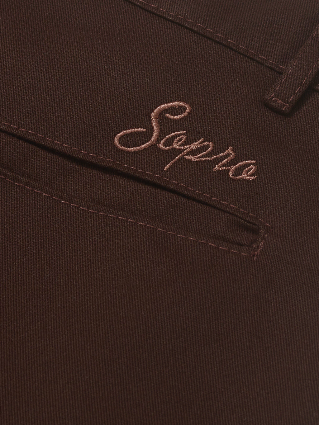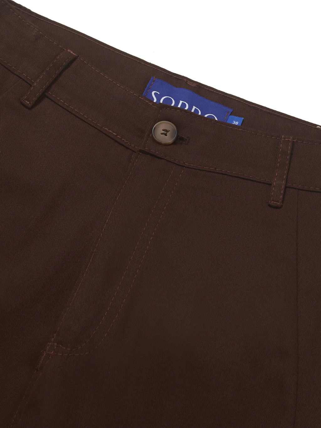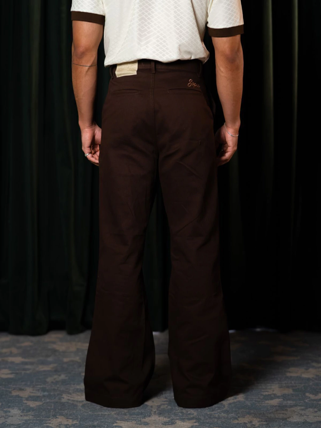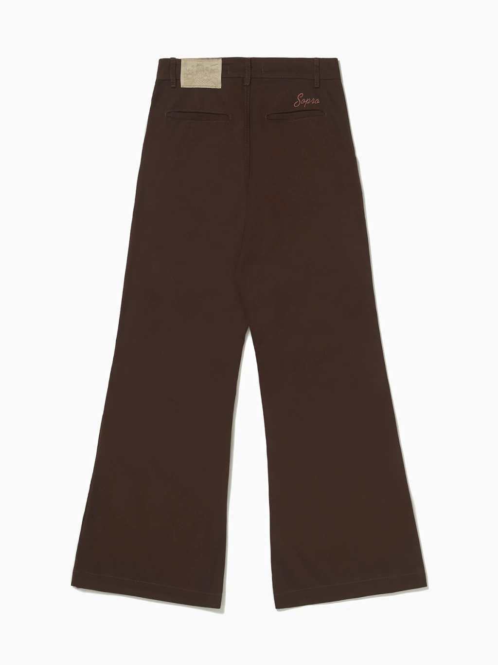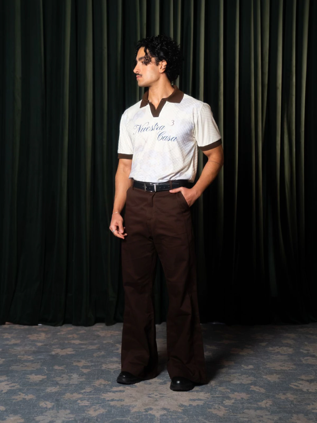 Aconchego leva para a alfaiataria um calor suave, aquele que existe mesmo nos gestos mais sóbrios da nossa casa latino americana. Feita em sarja estruturada, ela tem cintura alta e um flare leve, discreto, que alonga a silhueta sem perder a firmeza do desenho masculino.