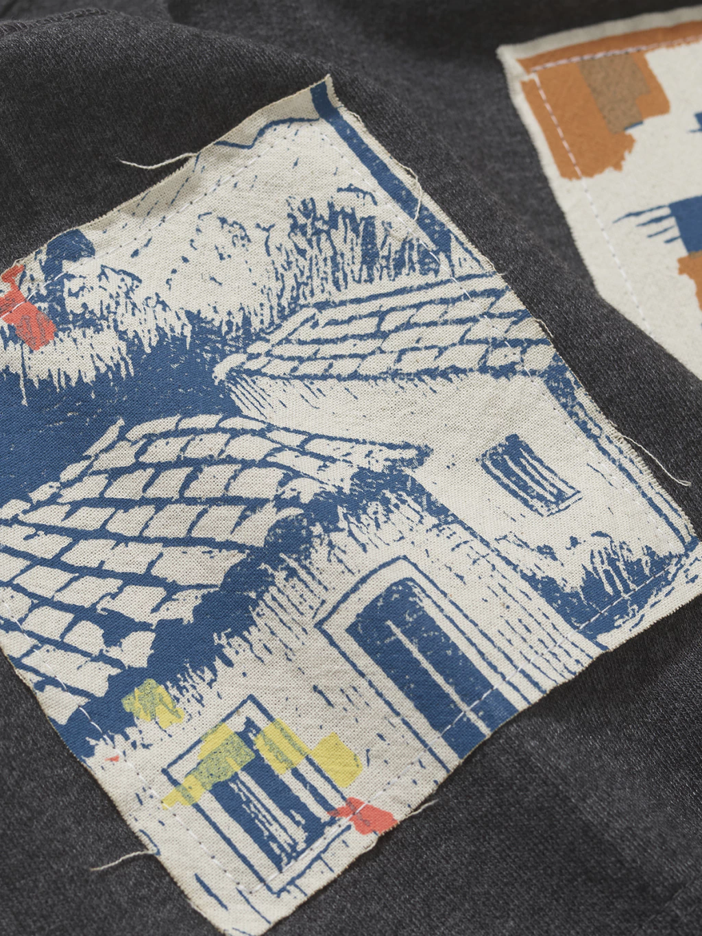 A Casitas é uma homenagem à paisagem afetiva que forma a nossa casa latino americana. Em moletom grafite, o aplique de algodão cru cria uma cena de pequenas casas reunidas em um ambiente tropical, ladeadas por nuvens e pássaros que parecem passar devagar pelo céu.