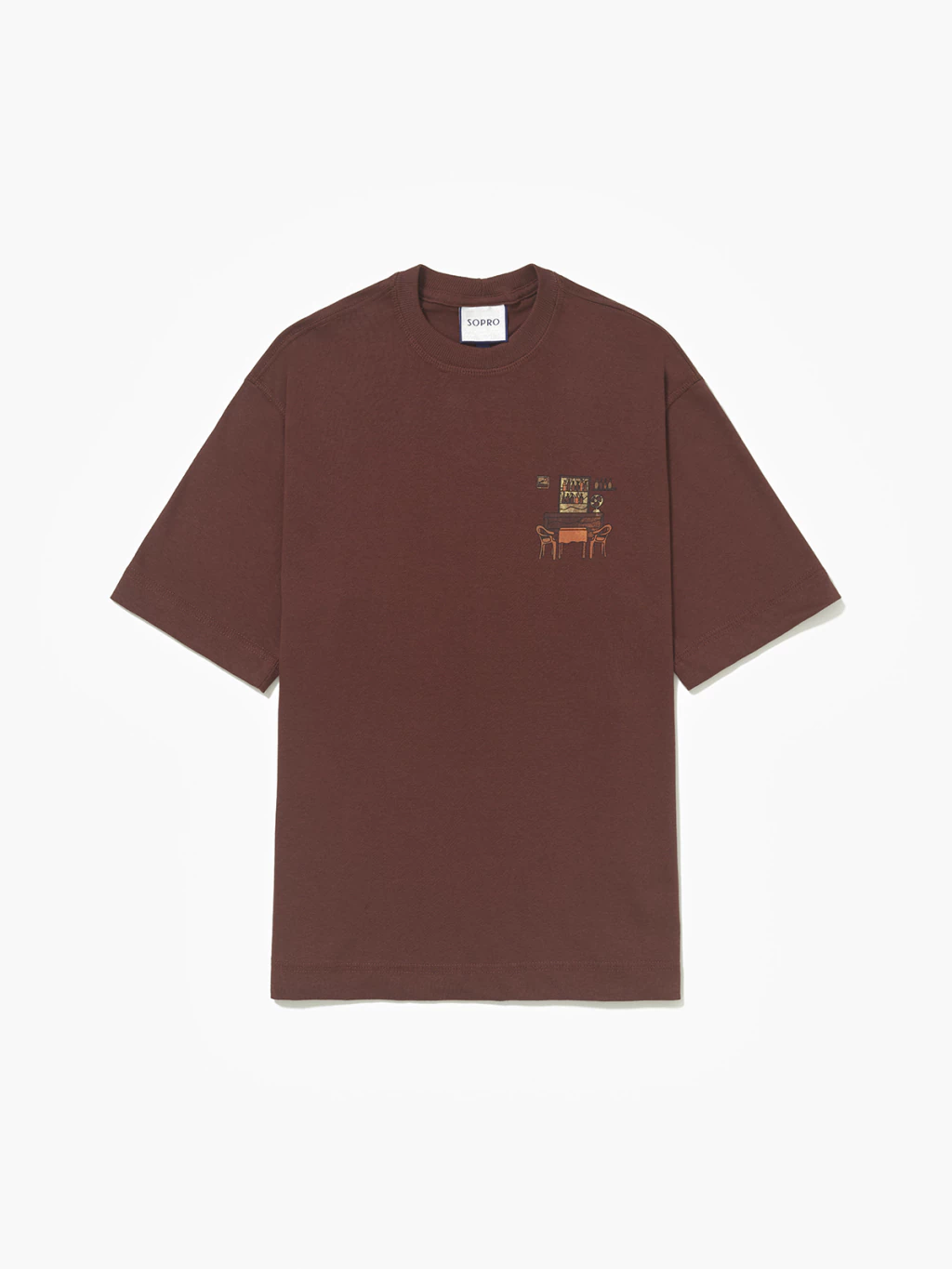 Em marrom profundo, a camiseta guarda o calor da terra e o aconchego de estar entre os nossos, como quem encontra abrigo dentro da própria cultura.