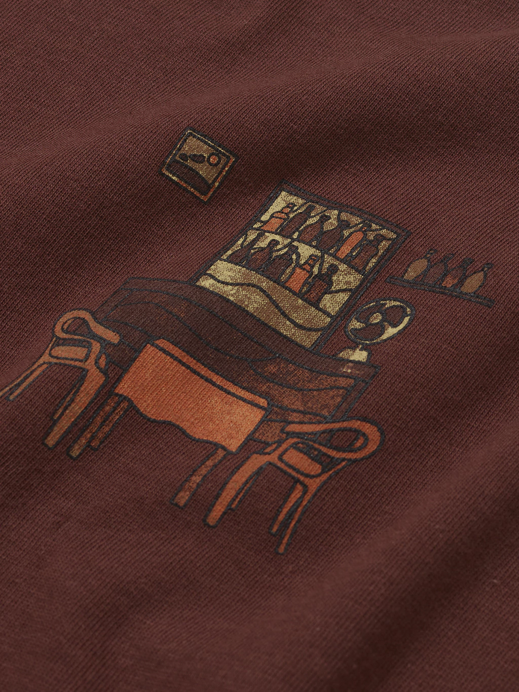 A Cena em Ladrilho nasce da ideia de que nossa casa latino americana também é feita de encontros. Nas costas, a estampa se abre como um mosaico terroso que retrata a cena de um bar, com pessoas dividindo histórias, olhares e a calma boa de fim de tarde.